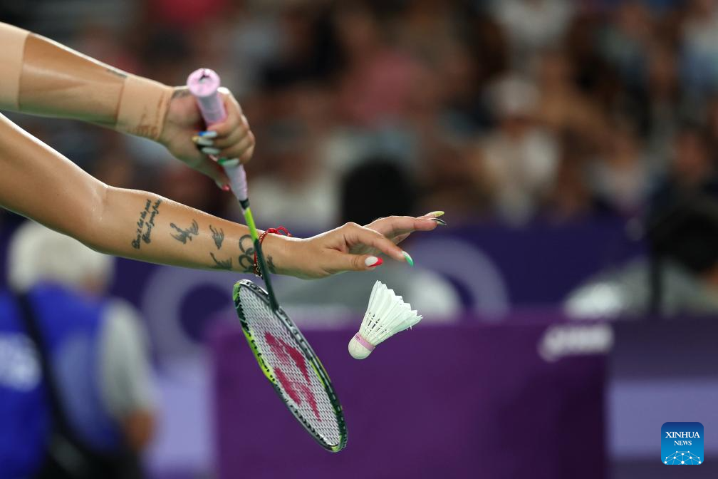 Gabriela Stoeva of Bulgaria serves during the badminton women's doubles quarterfinal match between Chen Qingchen/Jia Yifan of China and Gabriela Stoeva/Stefani Stoeva of Bulgaria at the Paris 2024 Olympic Games in Paris, France, on Aug. 1, 2024. (Xinhua/Chen Bin)