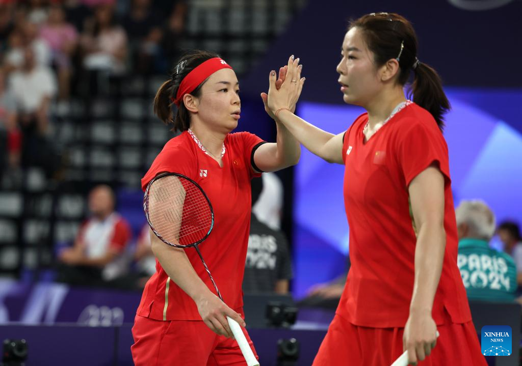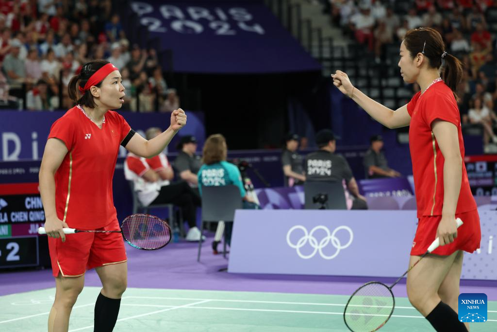 Chen Qingchen (L)/Jia Yifan of China celebrate scoring during the badminton women's doubles quarterfinal match between Chen Qingchen/Jia Yifan of China and Gabriela Stoeva/Stefani Stoeva of Bulgaria at the Paris 2024 Olympic Games in Paris, France, on Aug. 1, 2024. (Xinhua/Chen Bin)