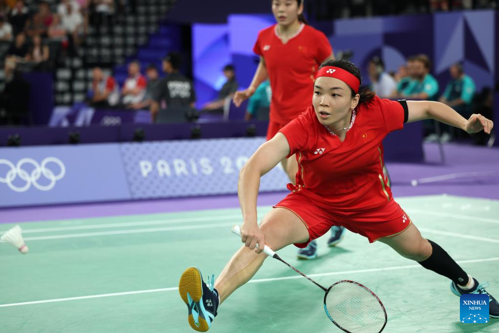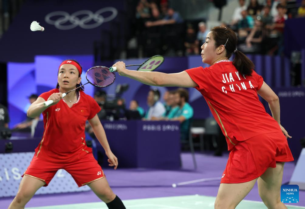 Chen Qingchen (L)/Jia Yifan of China compete during the badminton women's doubles quarterfinal match between Chen Qingchen/Jia Yifan of China and Gabriela Stoeva/Stefani Stoeva of Bulgaria at the Paris 2024 Olympic Games in Paris, France, on Aug. 1, 2024. (Xinhua/Chen Bin)
