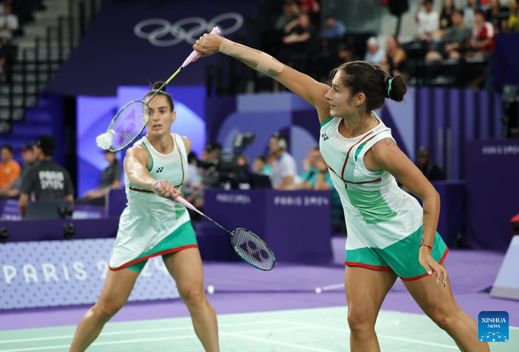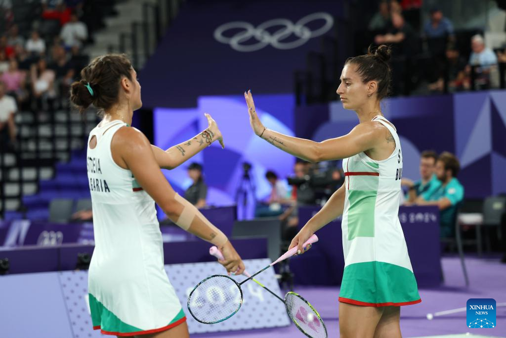 Gabriela Stoeva (R)/Stefani Stoeva of Bulgaria compete during the badminton women's doubles quarterfinal match between Chen Qingchen/Jia Yifan of China and Gabriela Stoeva/Stefani Stoeva of Bulgaria at the Paris 2024 Olympic Games in Paris, France, on Aug. 1, 2024. (Xinhua/Chen Bin)