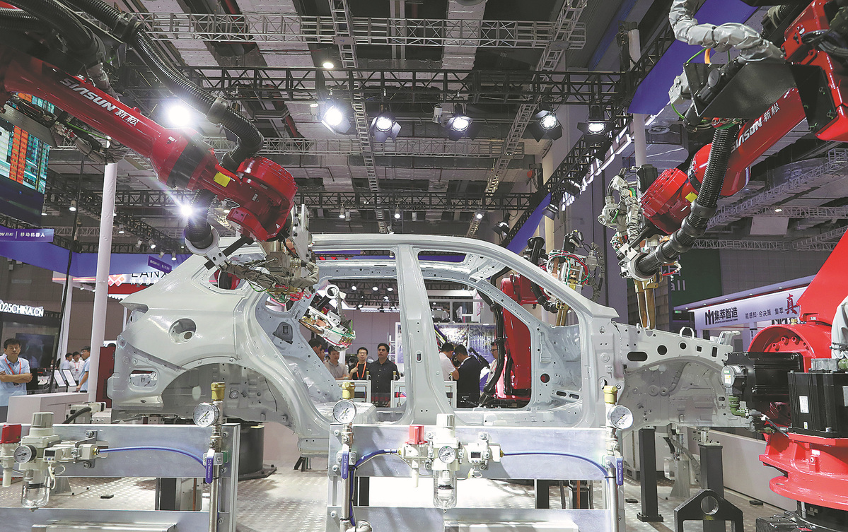 Visitors watch a robot welding a car body during the 23rd China International Industry Fair in Shanghai in September. (Photo/Xinhua)