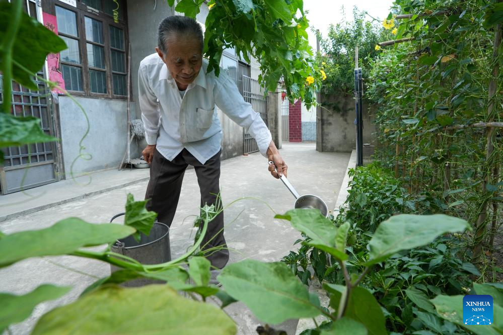 Ma Rusong waters vegetables in the yard at home in Shenyang Village of Taizhou City, east China's Jiangsu Province, July 31, 2024. (Xinhua/Li Bo)