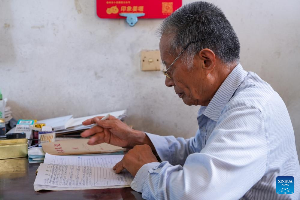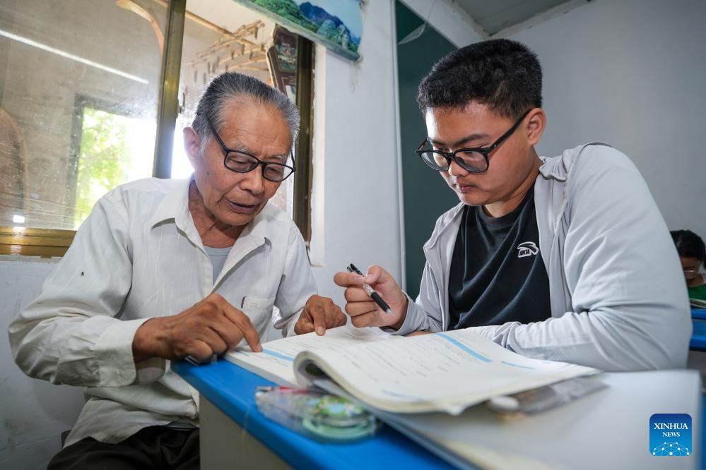 Ma Rusong (L) tutors a student at home in Shenyang Village of Taizhou City, east China's Jiangsu Province, July 31, 2024. (Xinhua/Li Bo)