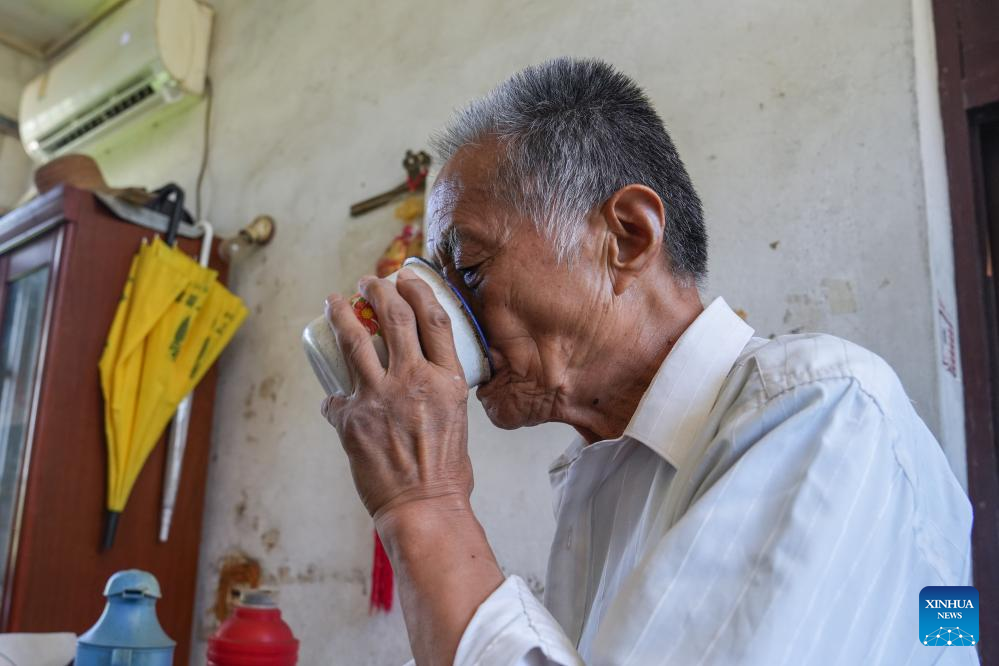 Ma Rusong drinks water during a class break at home in Shenyang Village of Taizhou City, east China's Jiangsu Province, July 31, 2024. (Xinhua/Li Bo)