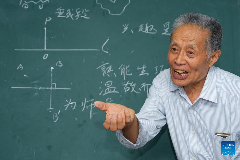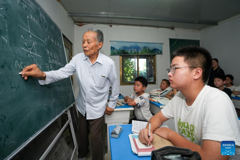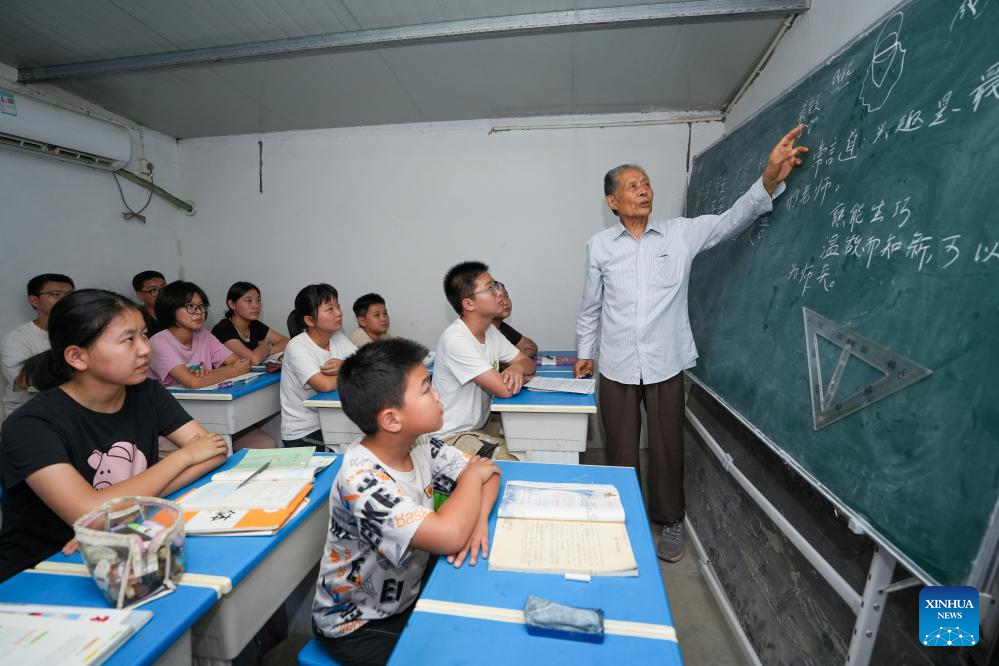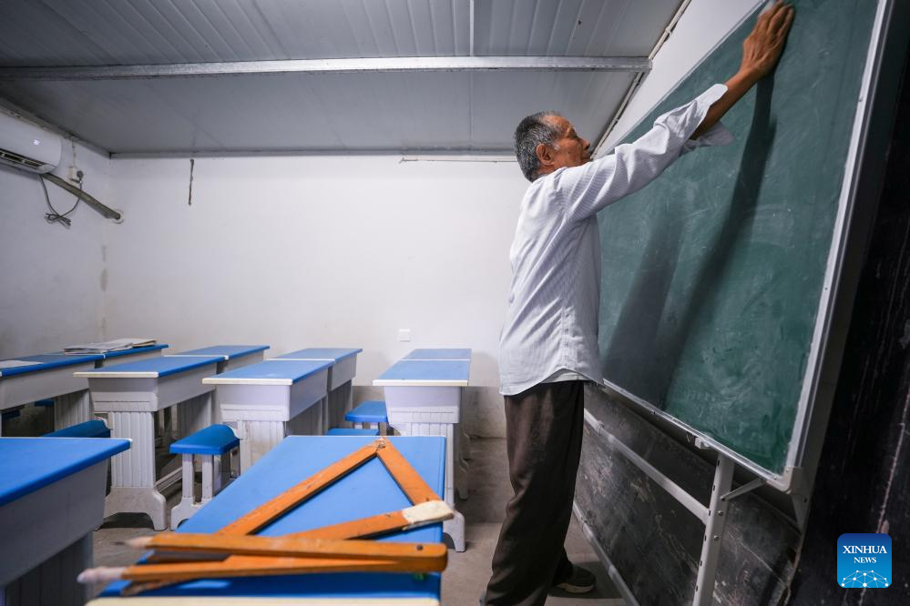 Ma Rusong cleans the blackboard after class at home in Shenyang Village of Taizhou City, east China's Jiangsu Province, July 30, 2024. (Xinhua/Wu Yingjing)