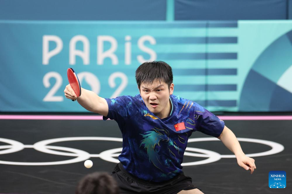 Fan Zhendong of China competes during the table tennis men's singles quarterfinal against Harimoto Tomokazu of Japan at Paris 2024 Olympic Games in Paris, France, Aug. 1, 2024. (Xinhua/Liu Xu)
