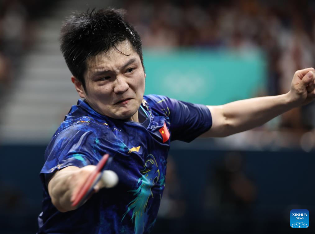 PARIS, Aug. 1 (Xinhua) -- China's Fan Zhendong endured a tough contest in the Olympic table tennis men's singles quarterfinals here on Thursday, being beaten in the first two sets before managing a 4-3 comeback win over Tomokazu Harimoto of Japan in a seven-set thriller.
