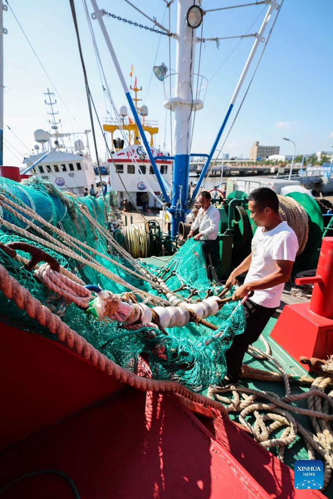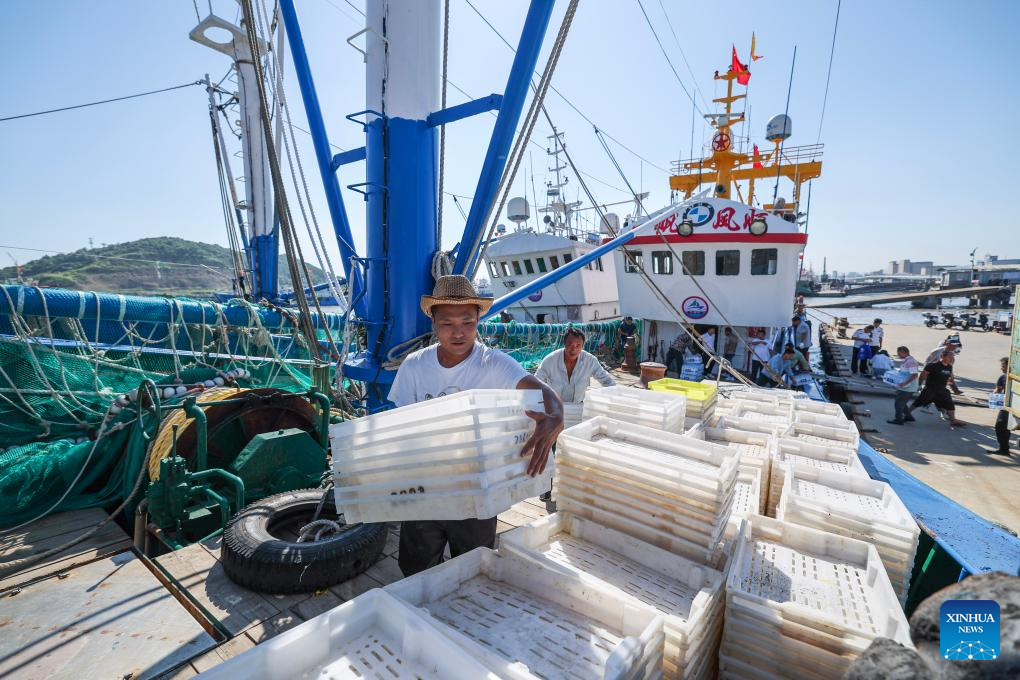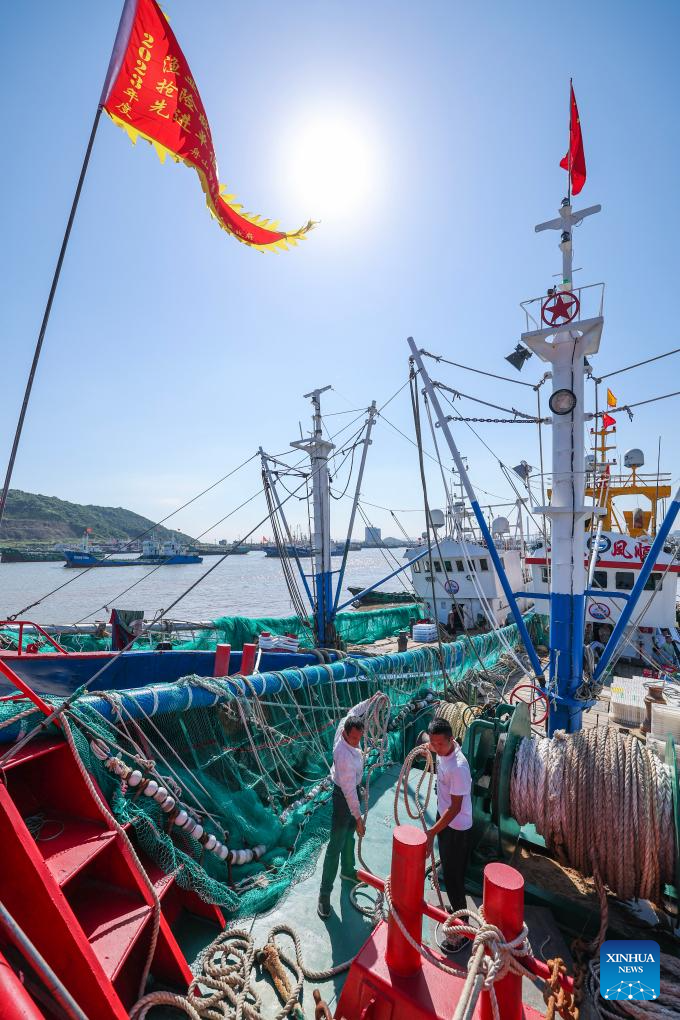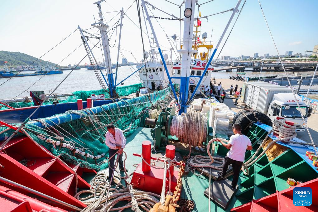 Fishermen prepare for fishing at the Shenjiamen fishing port in Zhoushan City, east China's Zhejiang Province, July 31, 2024. Four types of fishing boats with special permission set sail on Thursday after a three-month summer fishing ban in the East China Sea. (Xinhua/Xu Yu)