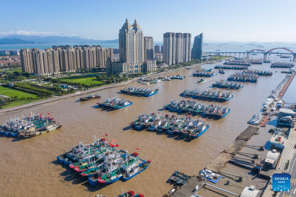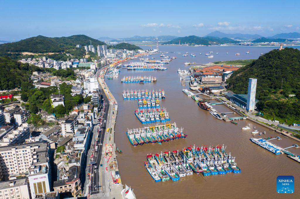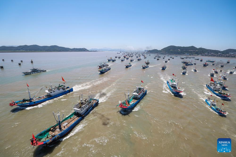 A drone photo taken on Aug. 1, 2024 shows fishing boats departing for fishing from the Shenjiamen fishing port in Zhoushan City, east China's Zhejiang Province. Four types of fishing boats with special permission set sail on Thursday after a three-month summer fishing ban in the East China Sea. (Xinhua/Xu Yu)
