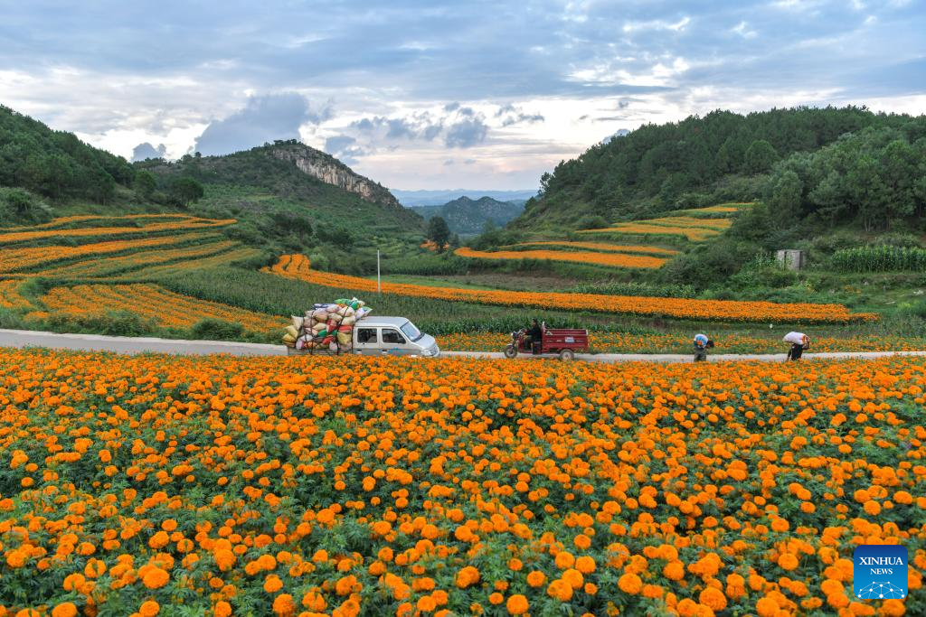 Villagers transfer newly-picked marigold flowers at Gaopo Village of Weining County, southwest China's Guizhou Province, July 30, 2024. More than 5,000 mu (about 333.3 hectares) of marigolds planted in Weining are in full bloom. Local planting cooperatives have been working with pharmaceutical enterprises to develop marigold planting, and to help farmers increase their income. Marigold is a raw material for herbal medicine. (Xinhua/Yang Wenbin)