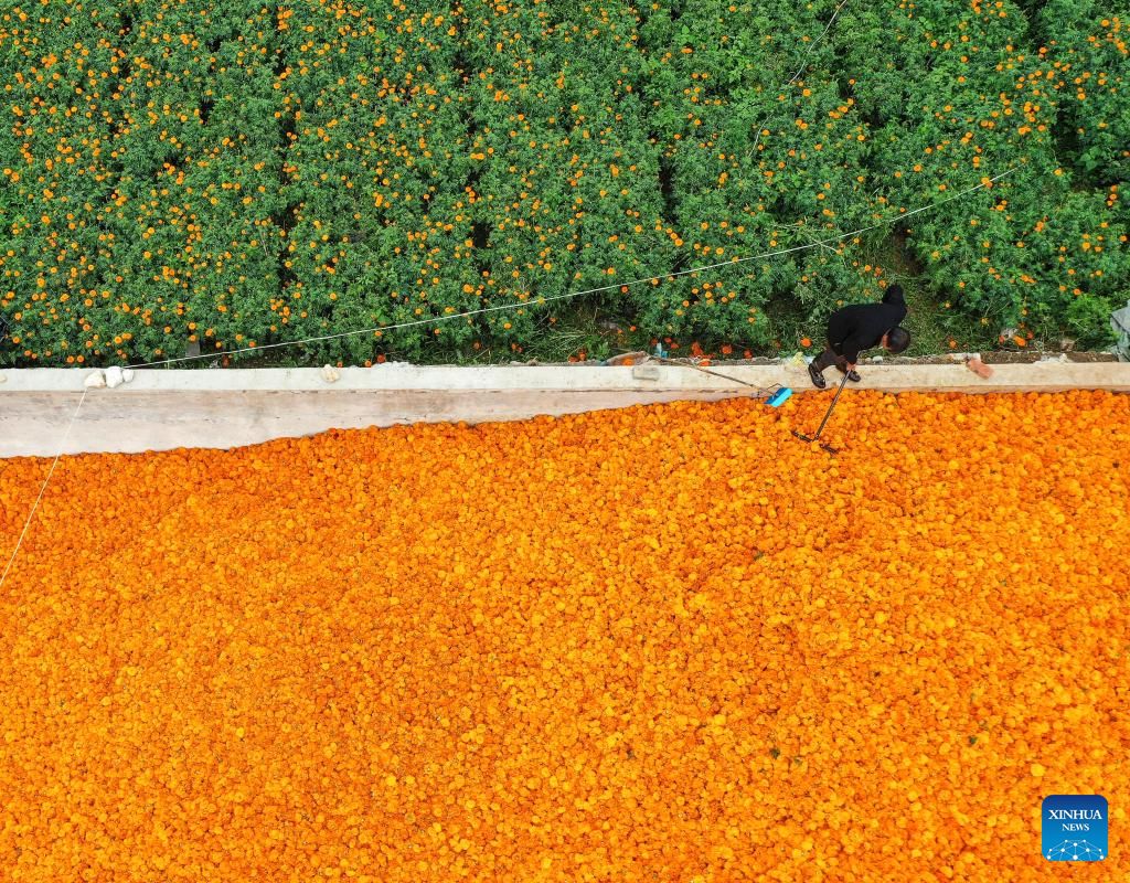 An aerial drone photo shows a villager airing marigold flowers at Zhengjiaying Village of Weining County, southwest China's Guizhou Province, July 30, 2024. More than 5,000 mu (about 333.3 hectares) of marigolds planted in Weining are in full bloom. Local planting cooperatives have been working with pharmaceutical enterprises to develop marigold planting, and to help farmers increase their income. Marigold is a raw material for herbal medicine. (Xinhua/Yang Wenbin)