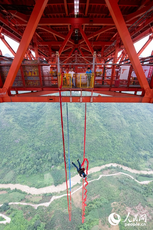 A tourist experiences bungee jumping at Baling River Bridge in southwest China’s Guizhou Province. (People’s Daily Online/Weng Qiyu)