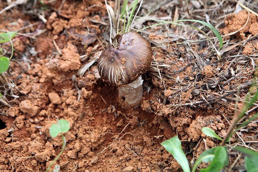 They may have succeeded, with mushrooms having a taste similar to the Collybia albuminosa mushroom recently starting to sprout at a cultivation base in Luowen village, Yulu Bai ethnic township, Nanhua county, Chuxiong Yi Autonomous Prefecture, southwest China’s Yunnan Province.
