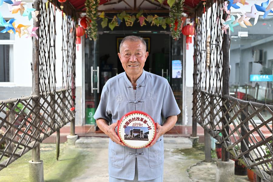 Yan Jinchang shows a drum at his village homestay in Xiaogang Village of Fengyang County, east China's Anhui Province, July 25, 2024. (Xinhua/Li Xin)