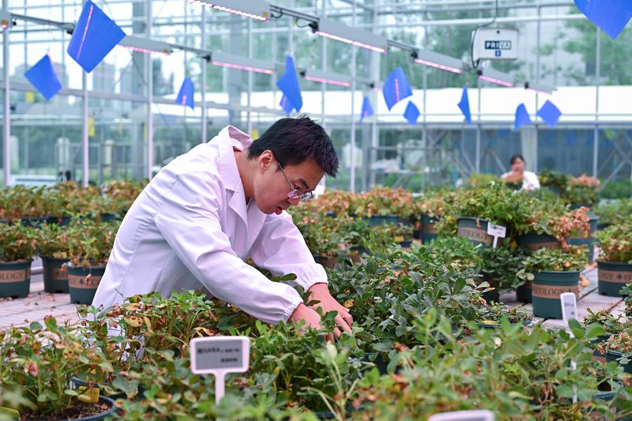 Shi Lei, a researcher from Central-China Agricultural Valley, checks peanuts growth in a phenotyping and speed breeding greenhouse in central China's Henan Province, July 29, 2024. (Xinhua/Li Xin)