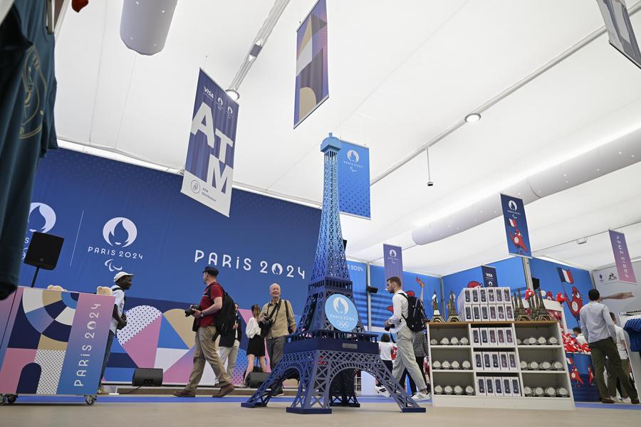 An Eiffel Tower-shaped souvenir is seen in the Paris 2024 official store on the Champs-Elysees Avenue in Paris, France, June 27, 2024. (Xinhua/He Changshan)