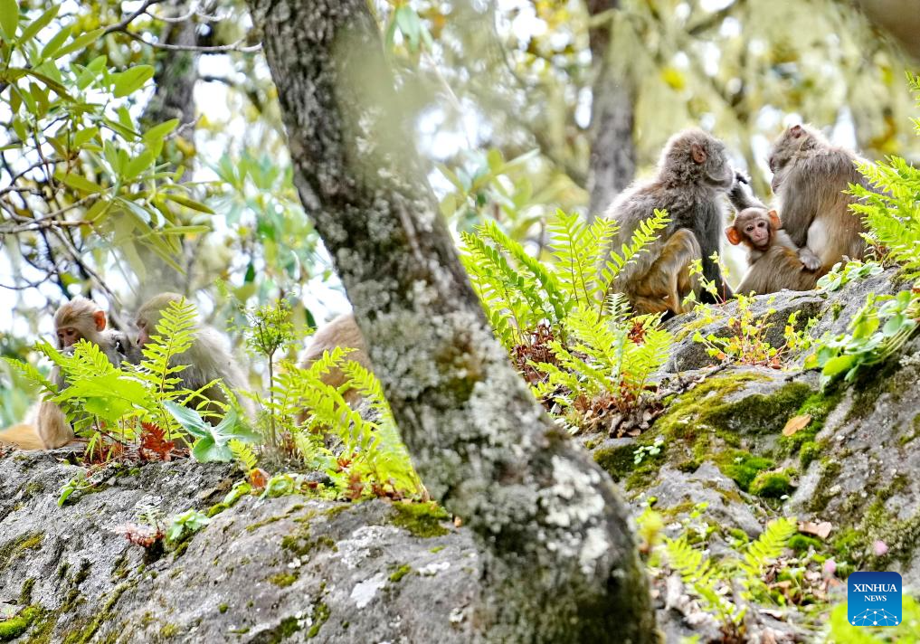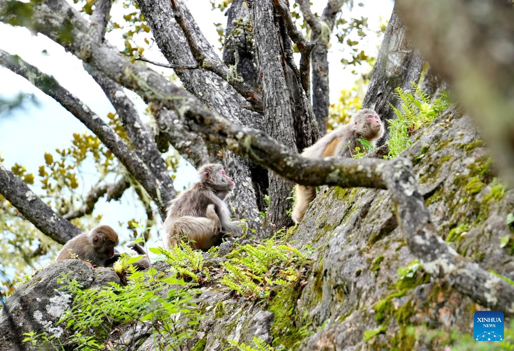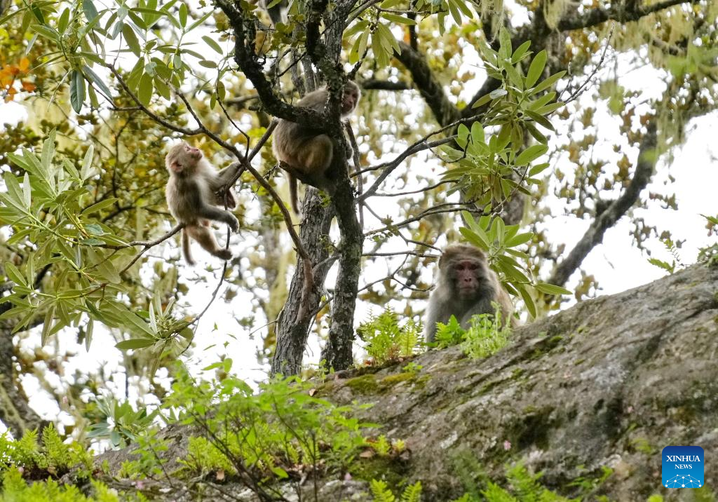 Tibetan macaques are pictured at Basomtso scenic area, a national 5A tourist attraction, in Nyingchi, southwest China's Xizang Autonomous Region, Aug. 2, 2024. (Xinhua/Zhang Rufeng)