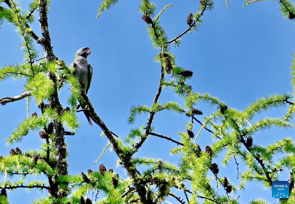 A parrot is pictured at Basomtso scenic area, a national 5A tourist attraction, in Nyingchi, southwest China's Xizang Autonomous Region, Aug. 2, 2024. (Xinhua/Zhang Rufeng)