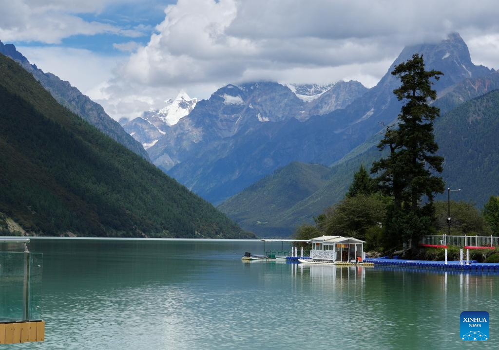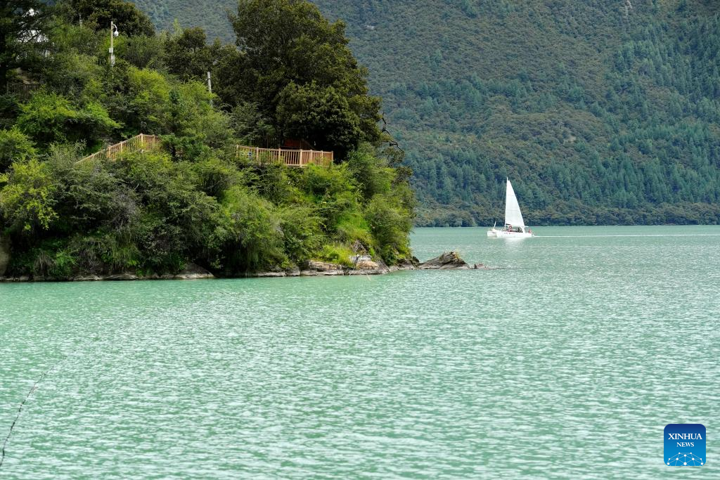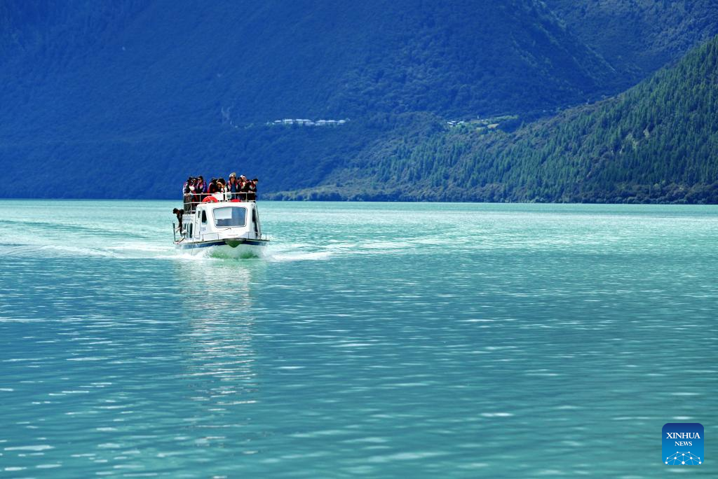 Tourists cruise the lake at Basomtso scenic area, a national 5A tourist attraction, in Nyingchi, southwest China's Xizang Autonomous Region, Aug. 2, 2024. (Xinhua/Zhang Rufeng)