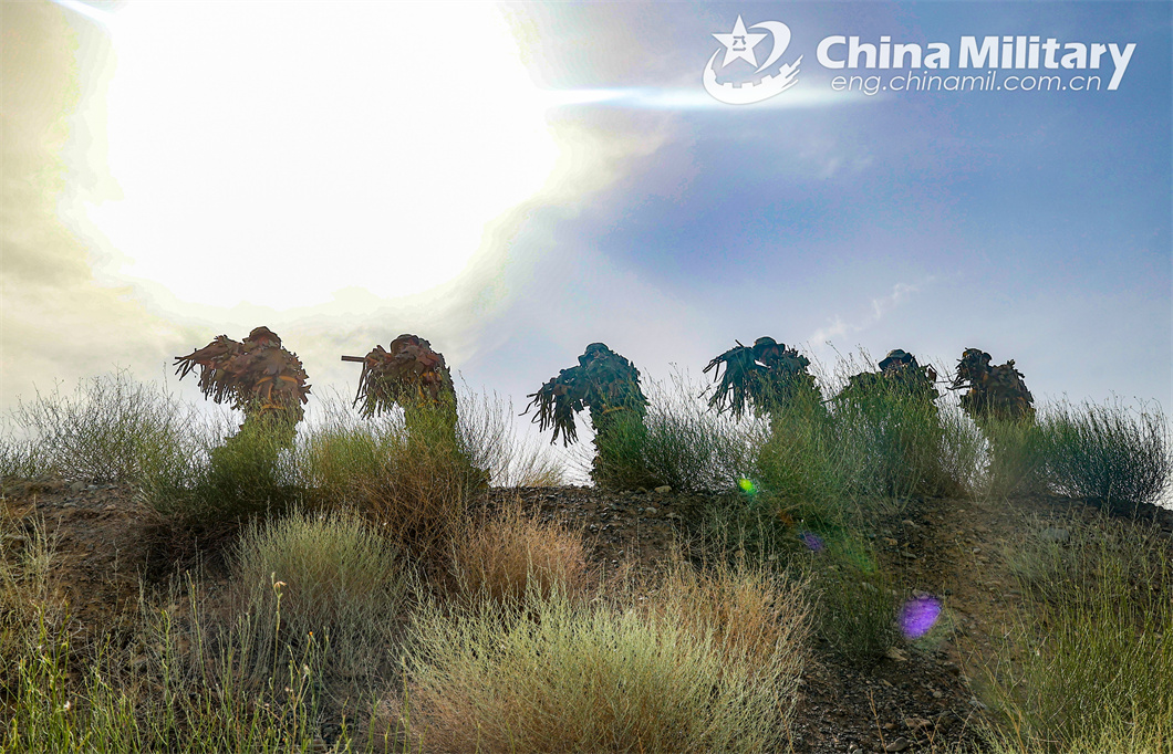 Soldiers assigned to a reconnaissance detachment of a regiment under the PLA Xinjiang Military Command advance while covering for each other by turns in a multi-subject training exercise in the field on June 26, 2024. (eng.chinamil.com.cn/Photo by Li Tianhua)