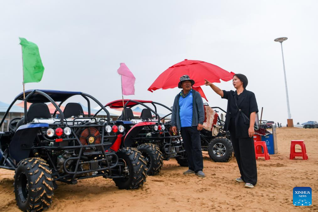 Li Fang (R) talks with a villager, who runs a desert off-roading business, at the Yinkentala Desert scenic spot in Dalad Banner, north China's Inner Mongolia Autonomous Region, July 30, 2024.(Xinhua/Li Zhipeng)