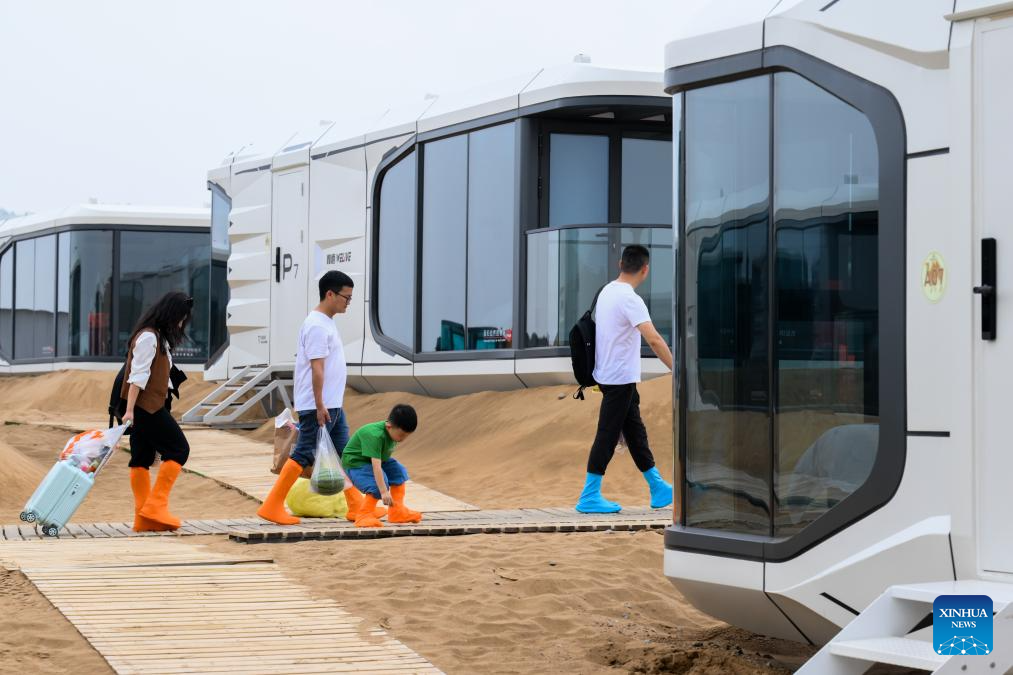 Tourists walk into a capsule camp at the Yinkentala Desert scenic spot in Dalad Banner, north China's Inner Mongolia Autonomous Region, July 30, 2024.(Xinhua/Li Zhipeng)