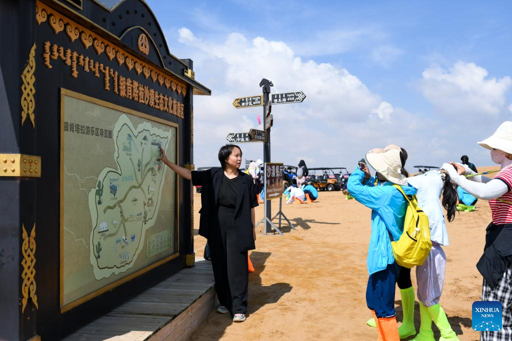 Li Fang (2nd R) guides tourists at the Yinkentala Desert scenic spot in Dalad Banner, north China's Inner Mongolia Autonomous Region, July 30, 2024.(Xinhua/Li Zhipeng)