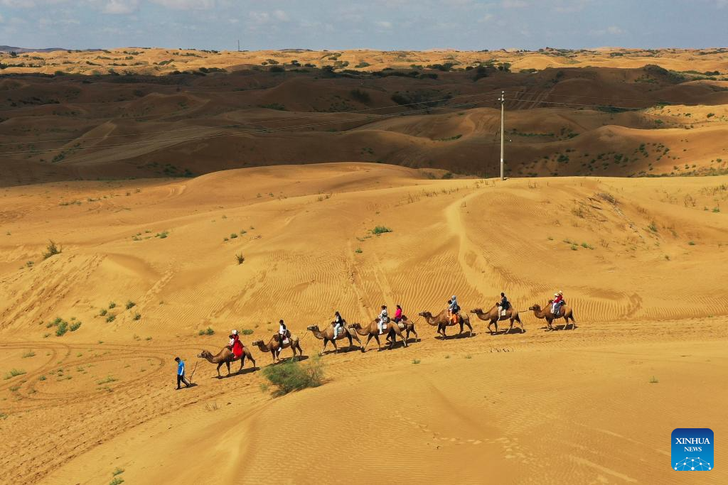 An aerial drone photo shows tourists riding camels at the Yinkentala Desert scenic spot in Dalad Banner, north China's Inner Mongolia Autonomous Region, July 31, 2024.(Xinhua/Li Zhipeng)