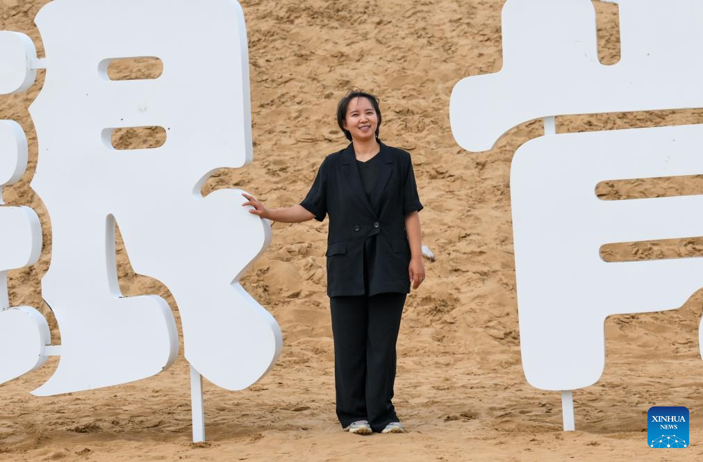 Li Fang poses for a photo at the Yinkentala Desert scenic spot in Dalad Banner, north China's Inner Mongolia Autonomous Region, July 30, 2024.(Xinhua/Li Zhipeng)
