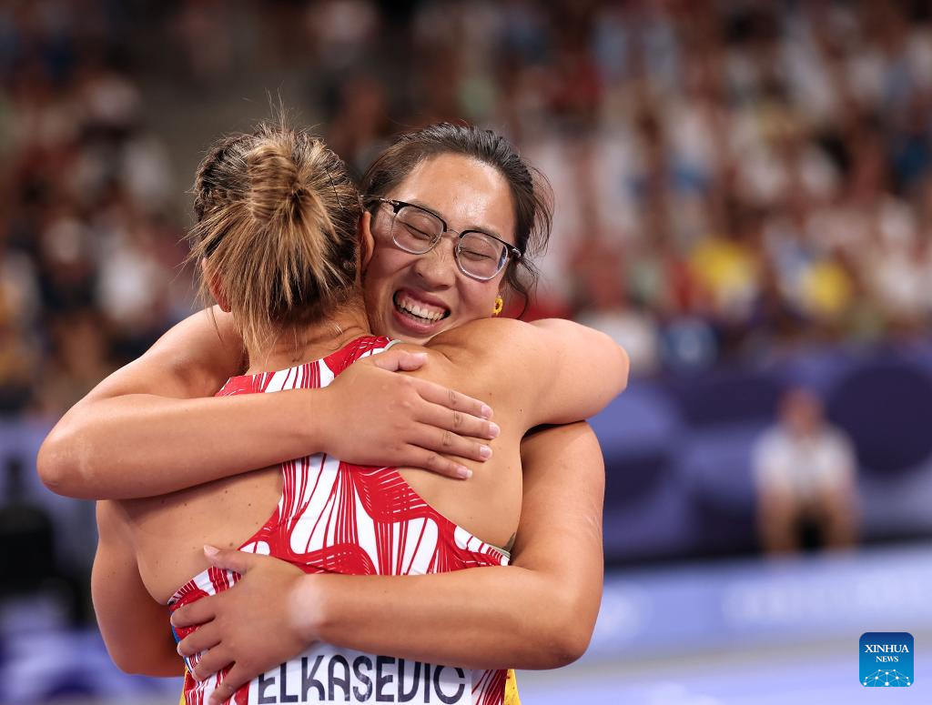 Feng Bin (back) of China celebrates with Sandra Elkasevic of Croatia after the women's discus throw final at the Paris 2024 Olympic Games in Paris, France, Aug. 5, 2024. (Xinhua/Li Ming)