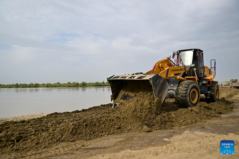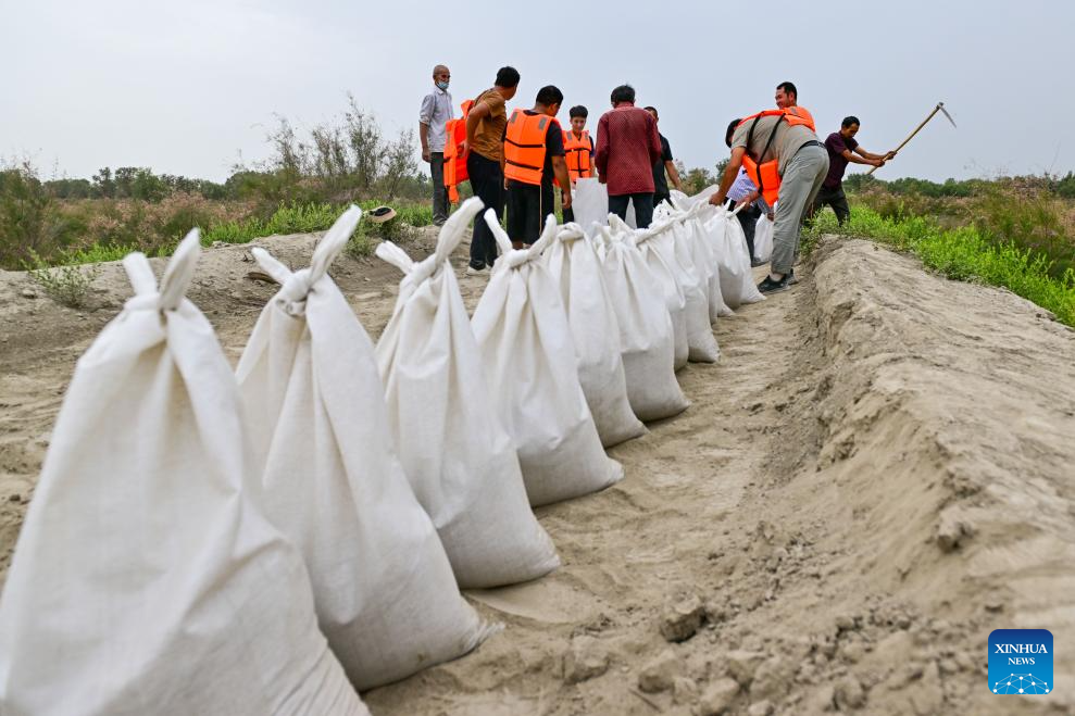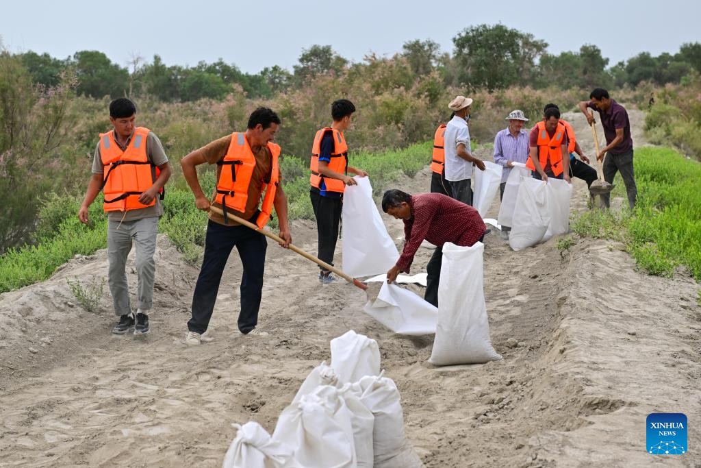 Emergency workers reinforce a dike in Xayar County, northwest China's Xinjiang Uygur Autonomous Region, Aug. 3, 2024. (Xinhua/Ding Lei)