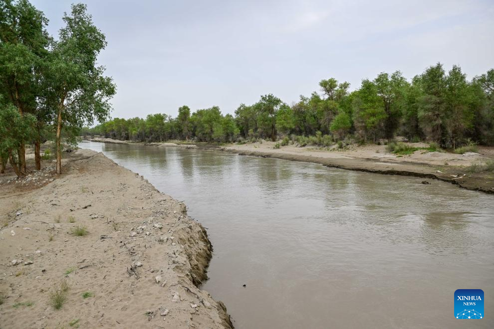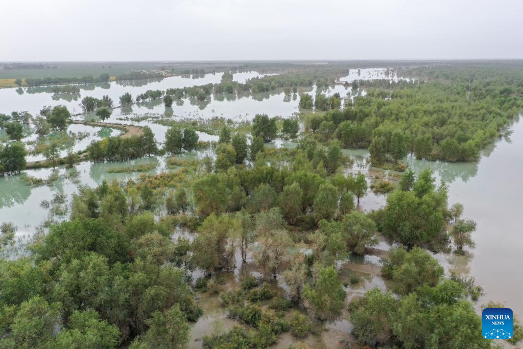This photo taken on Aug. 3, 2024 shows the Tarim River flood water diverted to irrigate a forest of populus euphratica in Xayar County, northwest China's Xinjiang Uygur Autonomous Region. (Xinhua/Ding Lei)