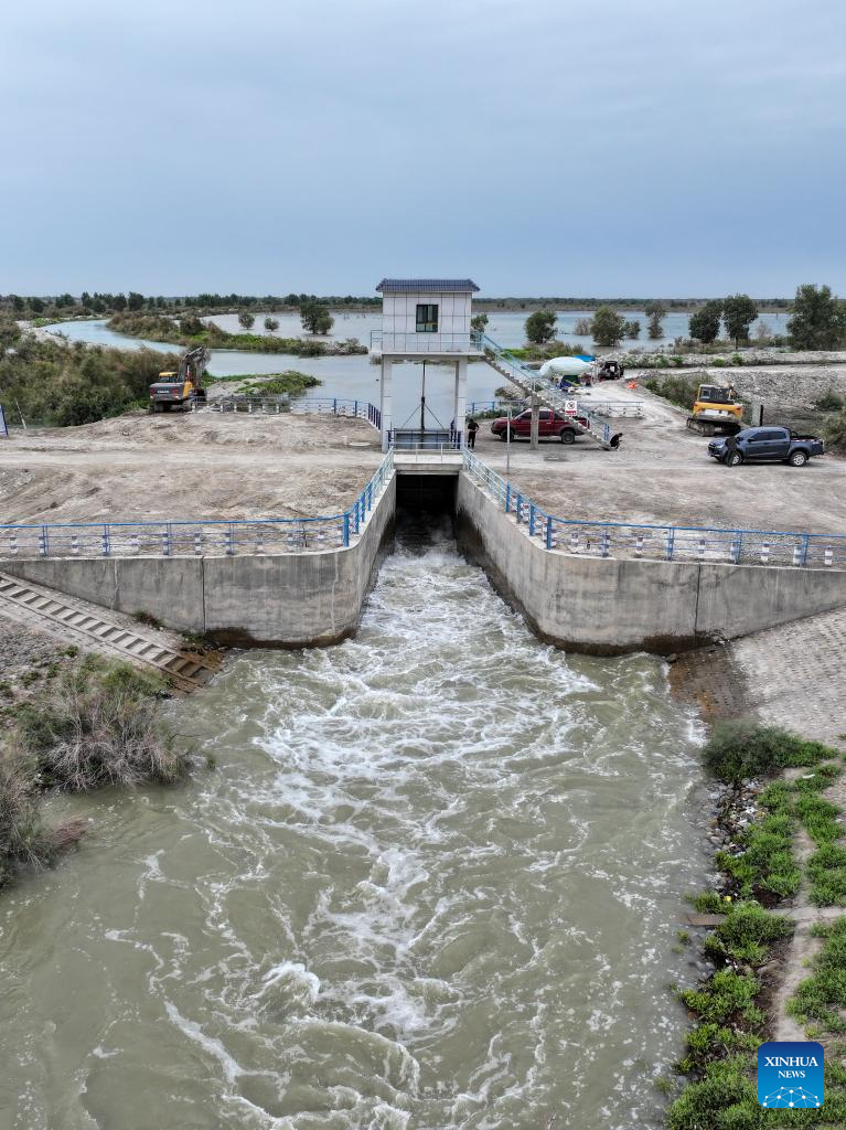 This aerial drone photo taken on Aug. 4, 2024 shows an open sluice gate diverting flood water to irrigate a forest of populus euphratica in Xayar County, northwest China's Xinjiang Uygur Autonomous Region. (Xinhua/Ding Lei)