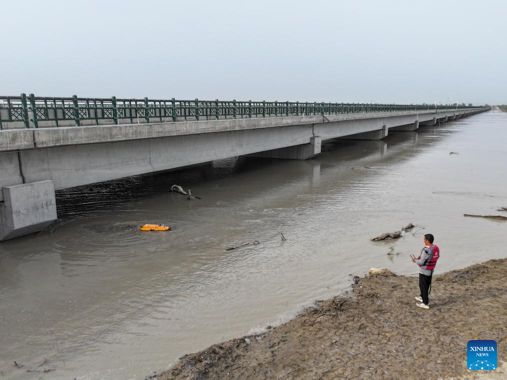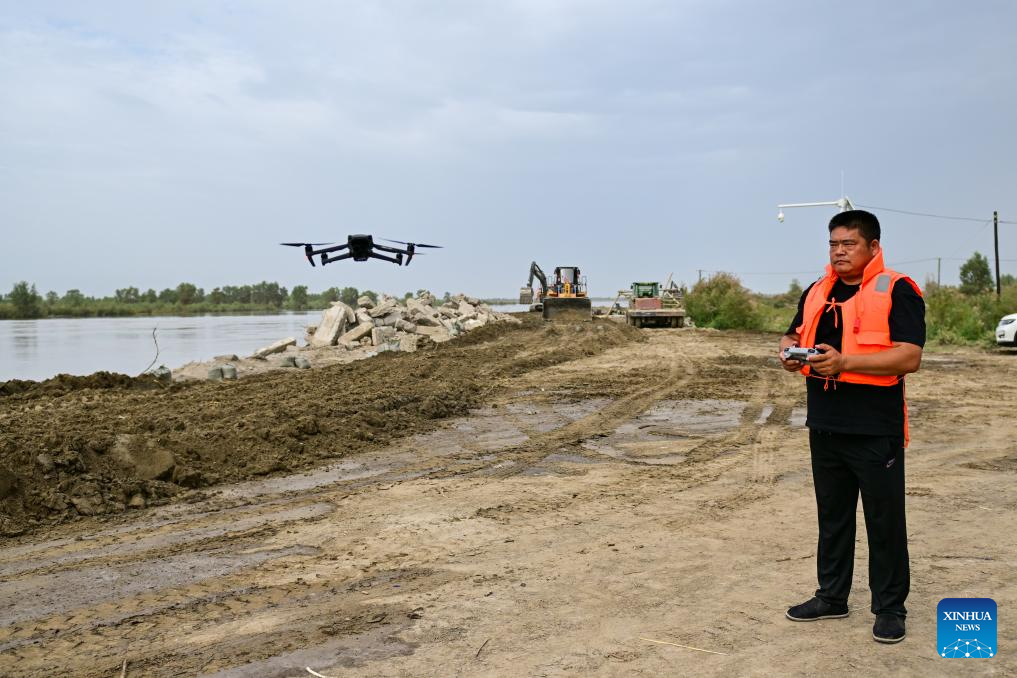 A rescuer uses a drone to monitor river condition in Xayar County, northwest China's Xinjiang Uygur Autonomous Region, Aug. 3, 2024. Affected by high temperatures and heavy rainfall, the water volume of the Tarim River in Xinjiang Uygur Autonomous Region exceeds the alert level. Local authorities mobilized emergency responding teams that are on duty around the clock at the flood control front lines, and availed of water conservancy facilities to ensure public safety while maximizing the utilization of flooding water. (Xinhua/Ding Lei)