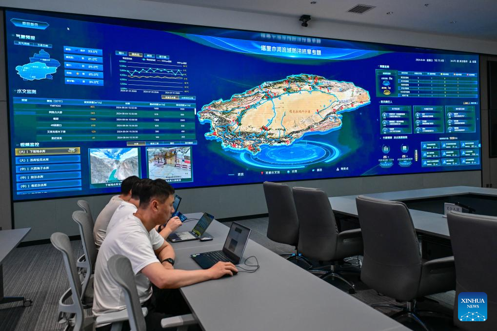 Staff members check real time flood control data at Xinjiang Tarim River Administration in northwest China's Xinjiang Uygur Autonomous Region, Aug. 4, 2024. (Xinhua/Ding Lei)