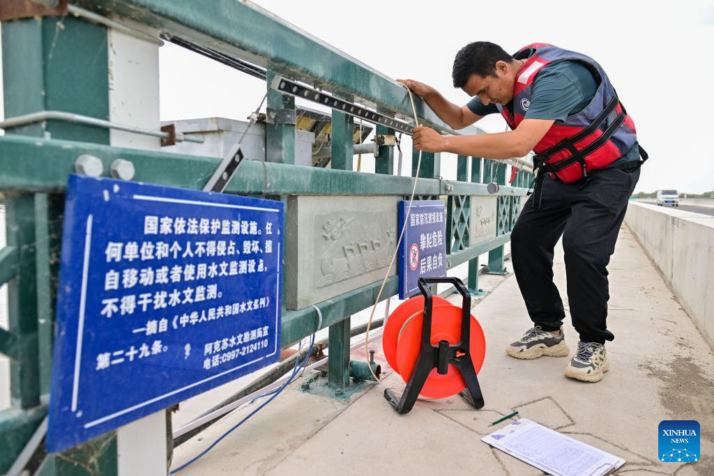 A worker collects hydrological data in Xayar County, northwest China's Xinjiang Uygur Autonomous Region, Aug. 3, 2024. (Xinhua/Ding Lei)