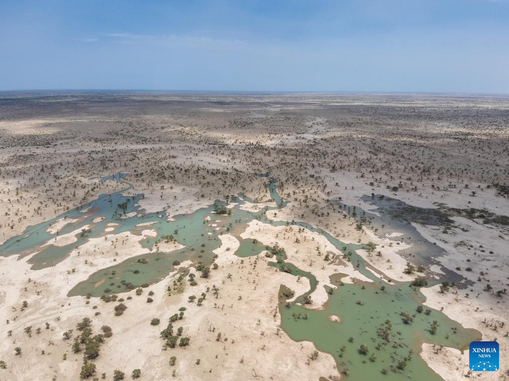 This aerial drone photo taken on Aug. 1, 2024 shows the Tarim River flood water diverted to irrigate a forest of populus euphratica in Xayar County, northwest China's Xinjiang Uygur Autonomous Region. (Photo by Qiang Limin/Xinhua)