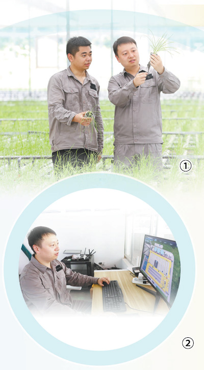 ①: Li Mai (R) checks on the growth of Chinese chives at a digital aquaponics factory that combines fish farming and vegetable growing in Liangping district, southwest China's Chongqing Municipality. (Photo/Liu Hui)