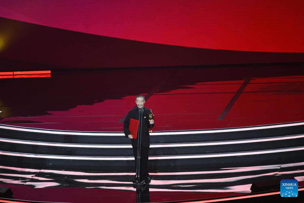Li Xuejian acknowledges receiving the Best Supporting Actor Award for his role in the film "Creation of the Gods I: Kingdom of Storms" at the awards ceremony of the 37th Hundred Flowers Awards in Chengdu, southwest China's Sichuan Province, Aug. 4, 2024. (Xinhua/Tang Wenhao)