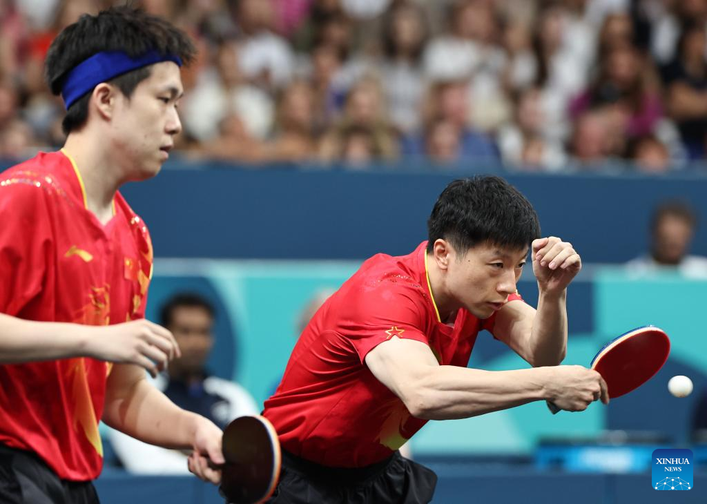 Ma Long (R)/Wang Chuqin of China compete against Harmeet Desai/Manav Vikash Thakkar of India during the men's team round of 16 match of table tennis between China and India at the Paris 2024 Olympic Games in Paris, France, on Aug. 6, 2024. (Xinhua/Wang Dongzhen)