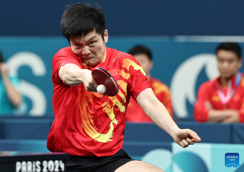 Fan Zhendong of China competes against Sharath Kamal Achanta of India during the men's team round of 16 match of table tennis between China and India at the Paris 2024 Olympic Games in Paris, France, on Aug. 6, 2024. (Xinhua/Wang Dongzhen)