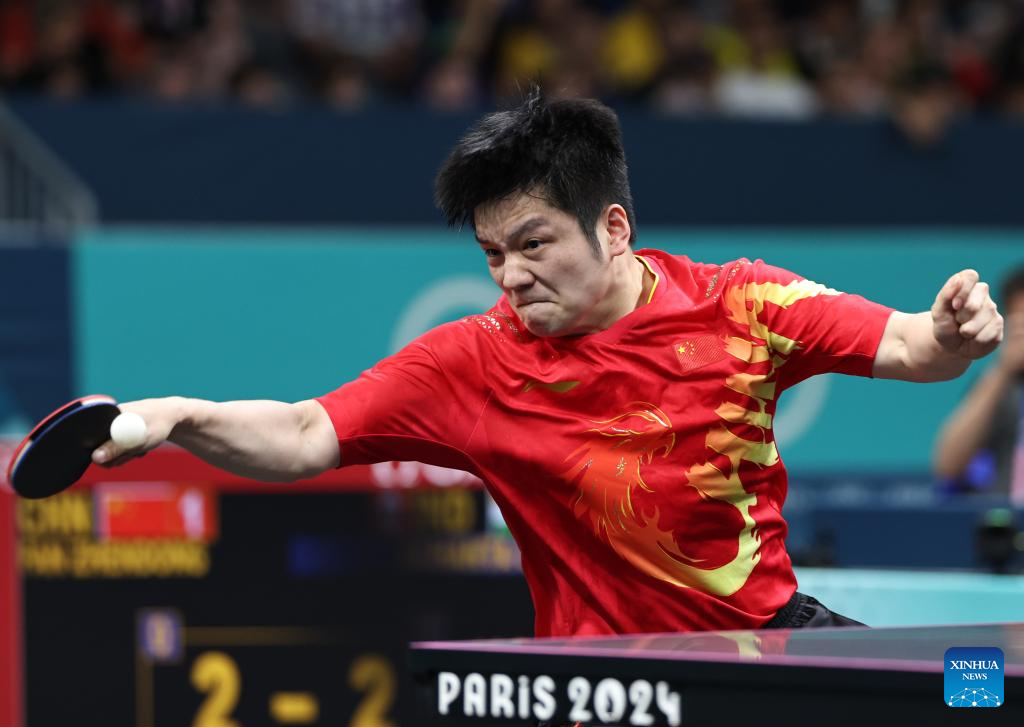 Fan Zhendong of China reacts while competing against Sharath Kamal Achanta of India during the men's team round of 16 match of table tennis between China and India at the Paris 2024 Olympic Games in Paris, France, on Aug. 6, 2024. (Xinhua/Wang Dongzhen)