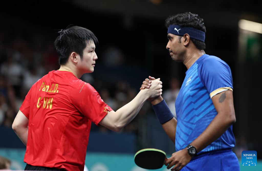 Fan Zhendong (L) of China greets Sharath Kamal Achanta of India after the men's team round of 16 match of table tennis between China and India at the Paris 2024 Olympic Games in Paris, France, on Aug. 6, 2024. (Xinhua/Wang Dongzhen)