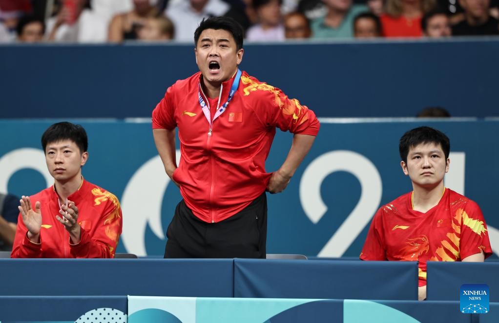 Coach Wang Hao (C) of China reacts during the men's team round of 16 match of table tennis between China and India at the Paris 2024 Olympic Games in Paris, France, on Aug. 6, 2024. (Xinhua/Wang Dongzhen)