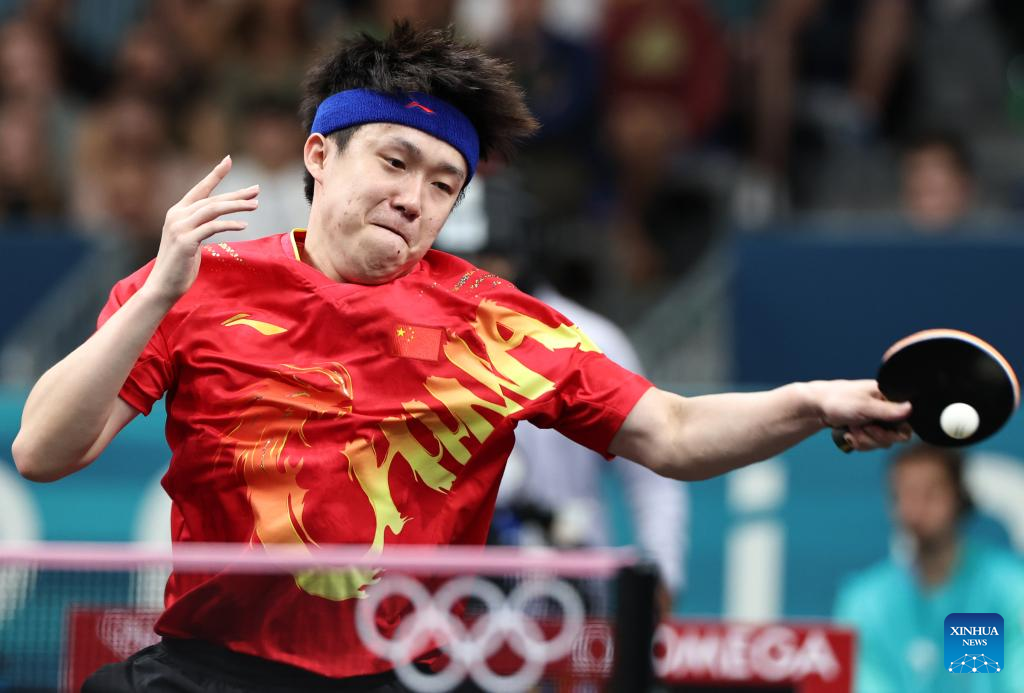 Wang Chuqin of China competes against Manav Vikash Thakkar of India during the men's team round of 16 match of table tennis between China and India at the Paris 2024 Olympic Games in Paris, France, on Aug. 6, 2024. (Xinhua/Wang Dongzhen)
