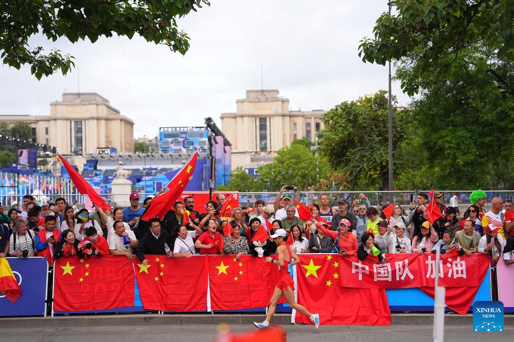 Spectators cheer for Zhang Jun (bottom) of China during the marathon race walk relay mixed of Athletics at the Paris 2024 Olympic Games in Paris, France, Aug. 7, 2024. (Xinhua/Xu Chang)