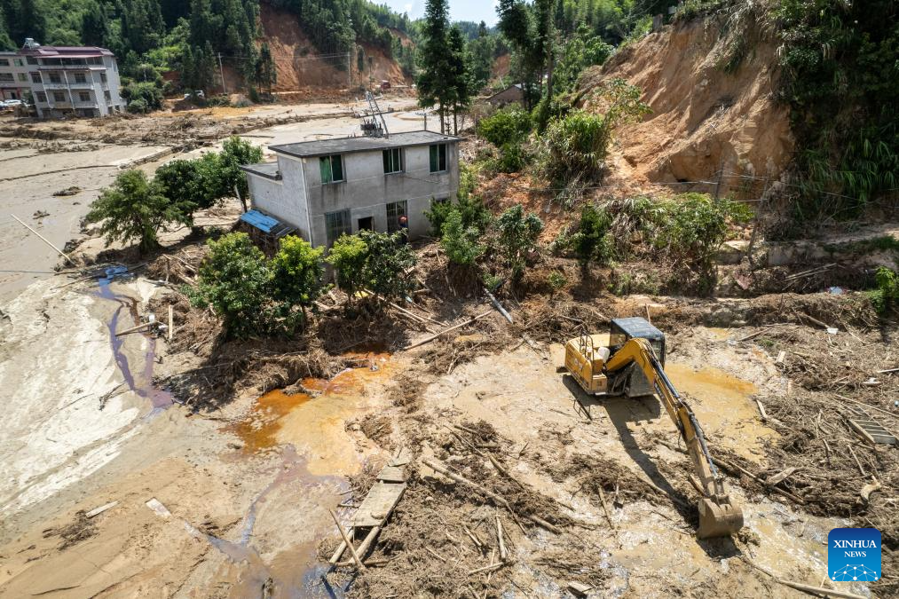 Workers repair a damaged road in Bailang Town of Zixing City, central China's Hunan Province, Aug. 7, 2024. Communication and power supplies have largely resumed in Zixing, a county-level city in Hunan Province. Rainstorms have wreaked havoc in Hunan since late July, triggering flash floods and landslides that destroyed homes and severed roads. (Xinhua/Chen Sihan)