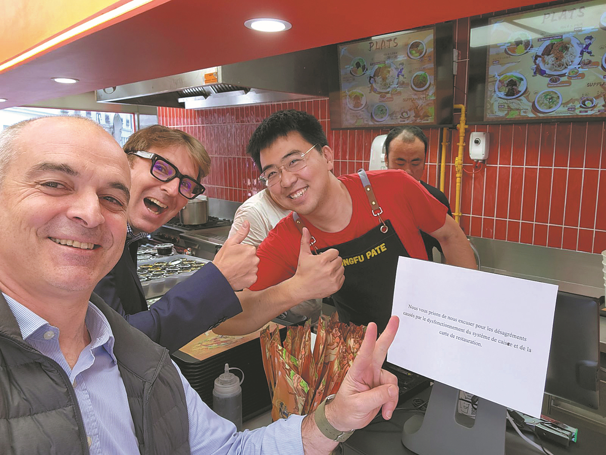 Guo Zhanglong, owner of the Kung Fu Daoxiaomian restaurant near Notre Dame in Paris, France, poses for a selfie with his guests. PHOTO/CHINA DAILY