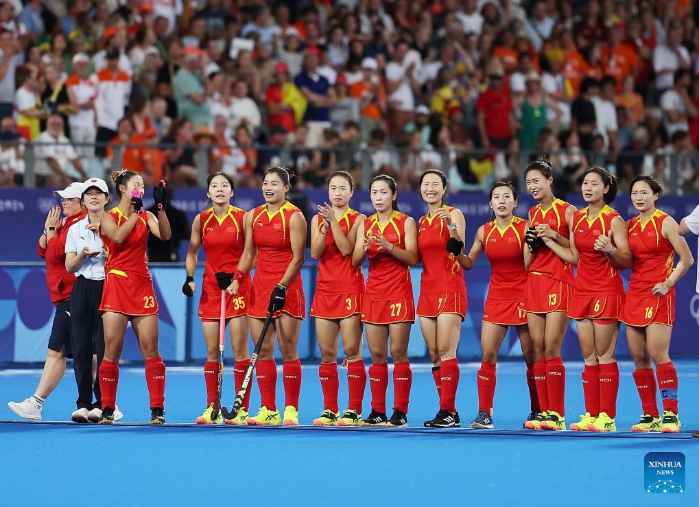 Team China react ahead of the women's hockey semi-final match between China and Belgium at the Paris 2024 Olympic Games in Colombes, France, Aug. 7, 2024. (Xinhua/Ren Pengfei)
