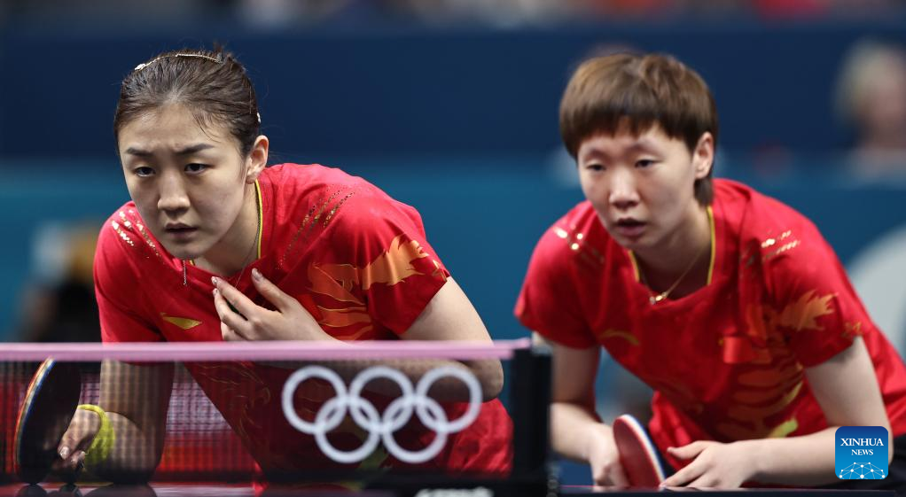 Chen Meng (L)/Wang Manyu of China react while competing against Chen Szu-Yu/Chien Tung-Chuan of Chinese Taipei during the women's team quarterfinal of table tennis between China and Chinese Taipei at the Paris 2024 Olympic Games in Paris, France, on Aug. 7, 2024. (Xinhua/Liu Xu)